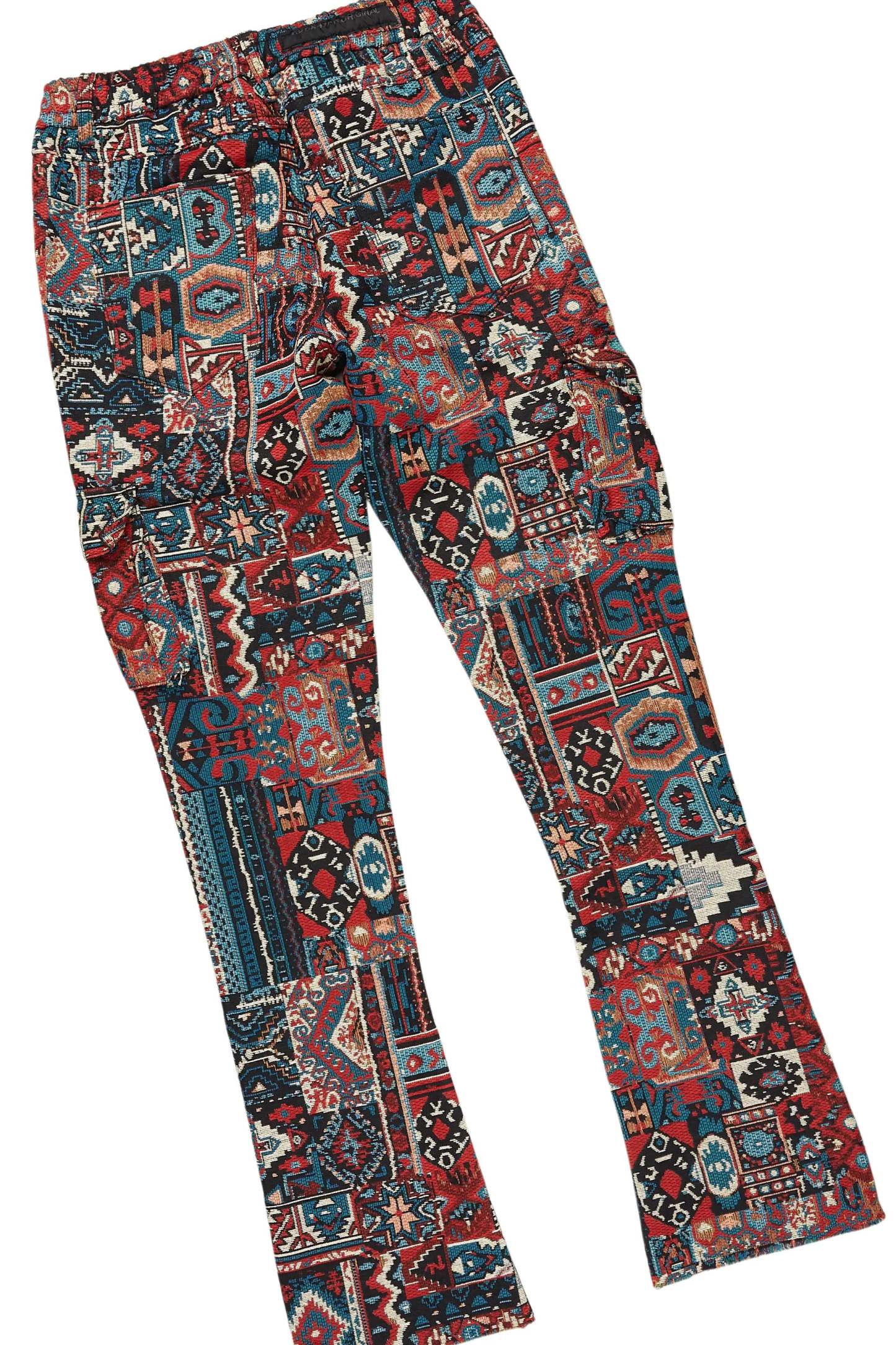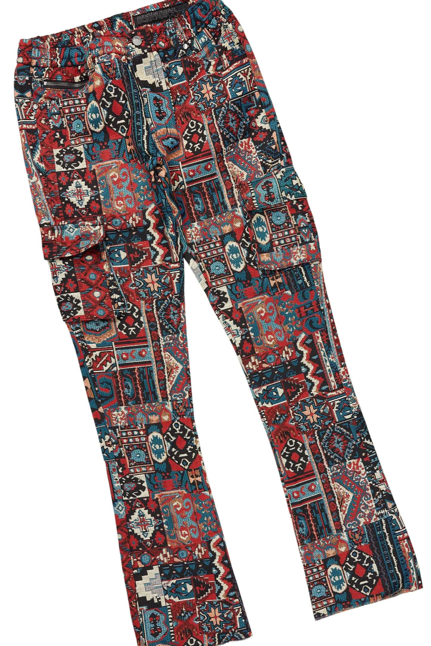 An urban tapestry bubble coat and cargo stacked jean set for men. Designed with premium fabric and custom detailing for a dope streetwear outfit.