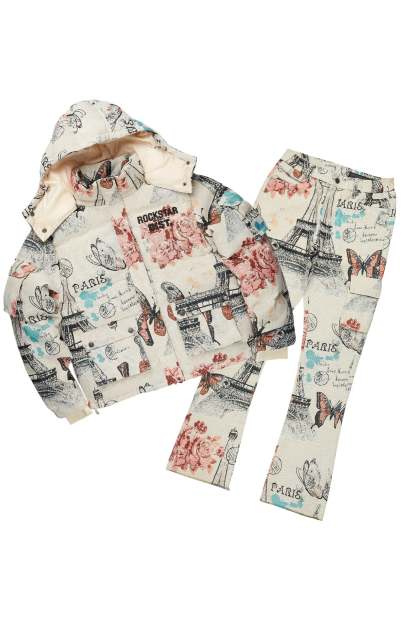 An urban tapestry bubble coat and cargo stacked jean set for men. Designed with premium fabric and custom detailing for a dope streetwear outfit.