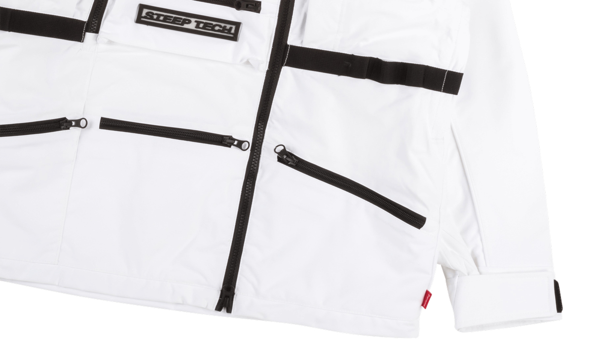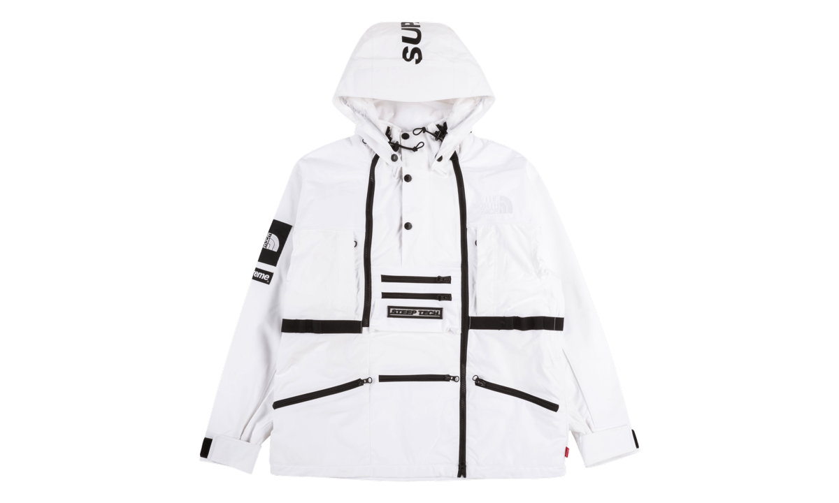 Presenting the bigger brother of the Steep Tech Sweatshirt from the Supreme x TNF collaboration, this all white grail status jacket makes for an unbelievable all weather jacket. Black zips and logos all over match the taped seams and buttons on this techwear masterpiece. Supreme and the North Face are a legendary combination, and this collab is nothing short of amazing.