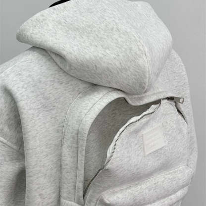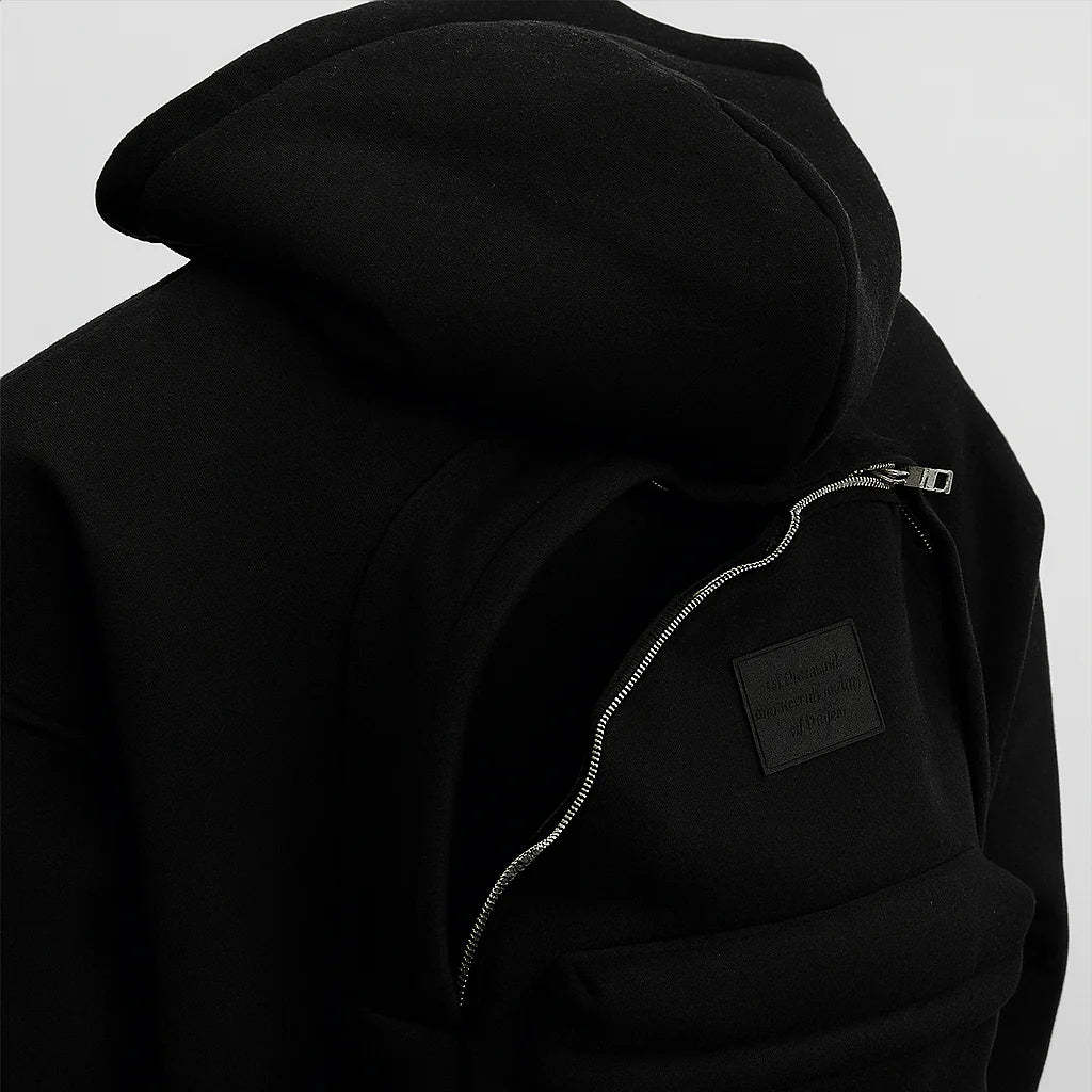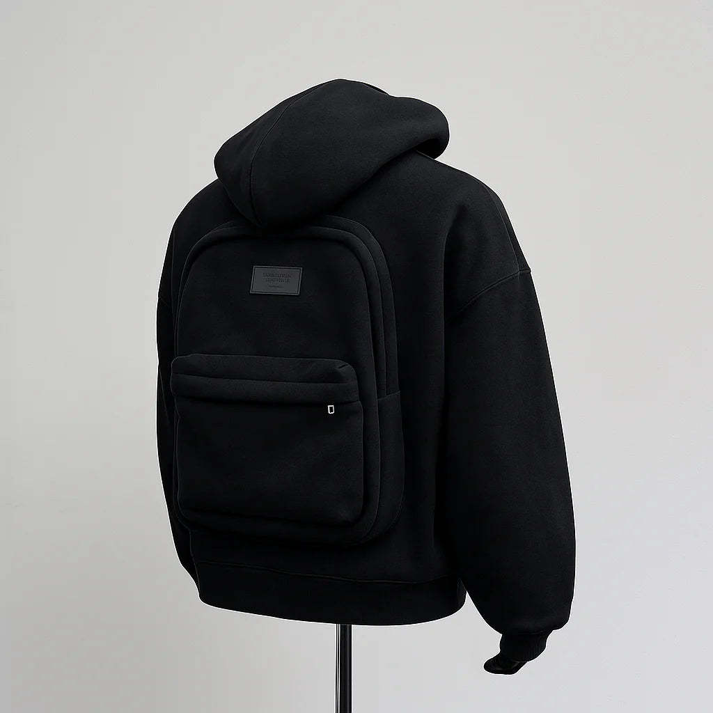 The Backpack Hoodie combines streetwear aesthetics with everyday practicality, redefining how you carry your essentials. Featuring a built-in backpack at the back, it allows you to store daily items without the need for an extra bag. The front is designed with a clean full-zip closure, paired with a relaxed hooded silhouette for comfort, warmth, and versatility.